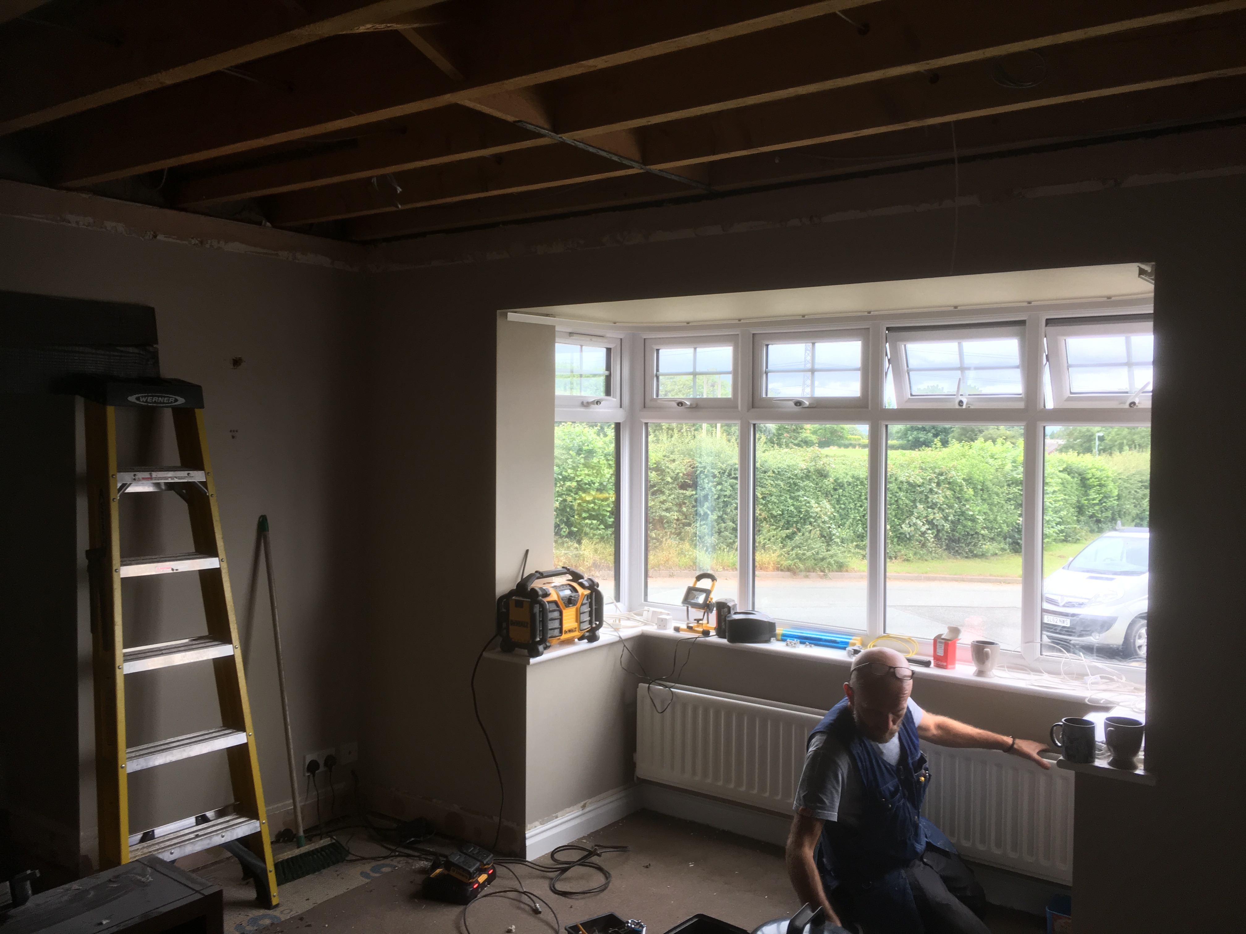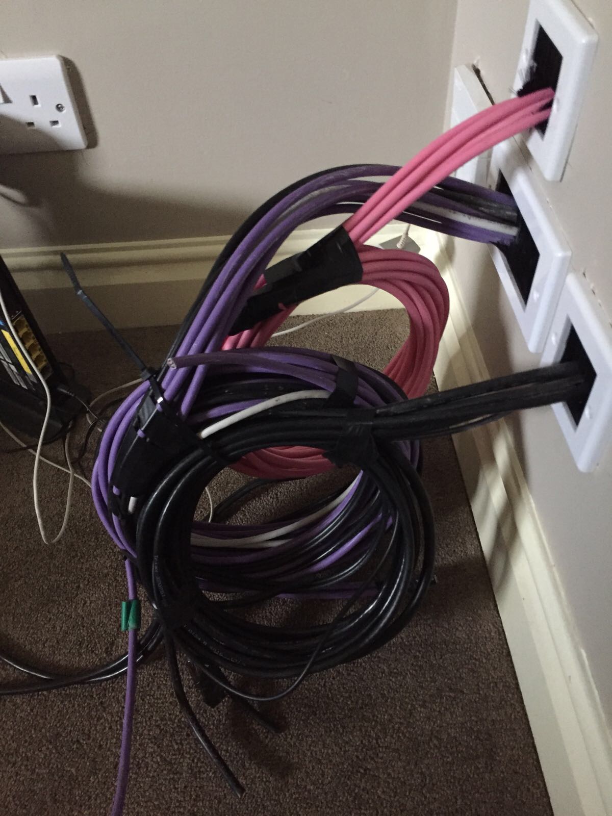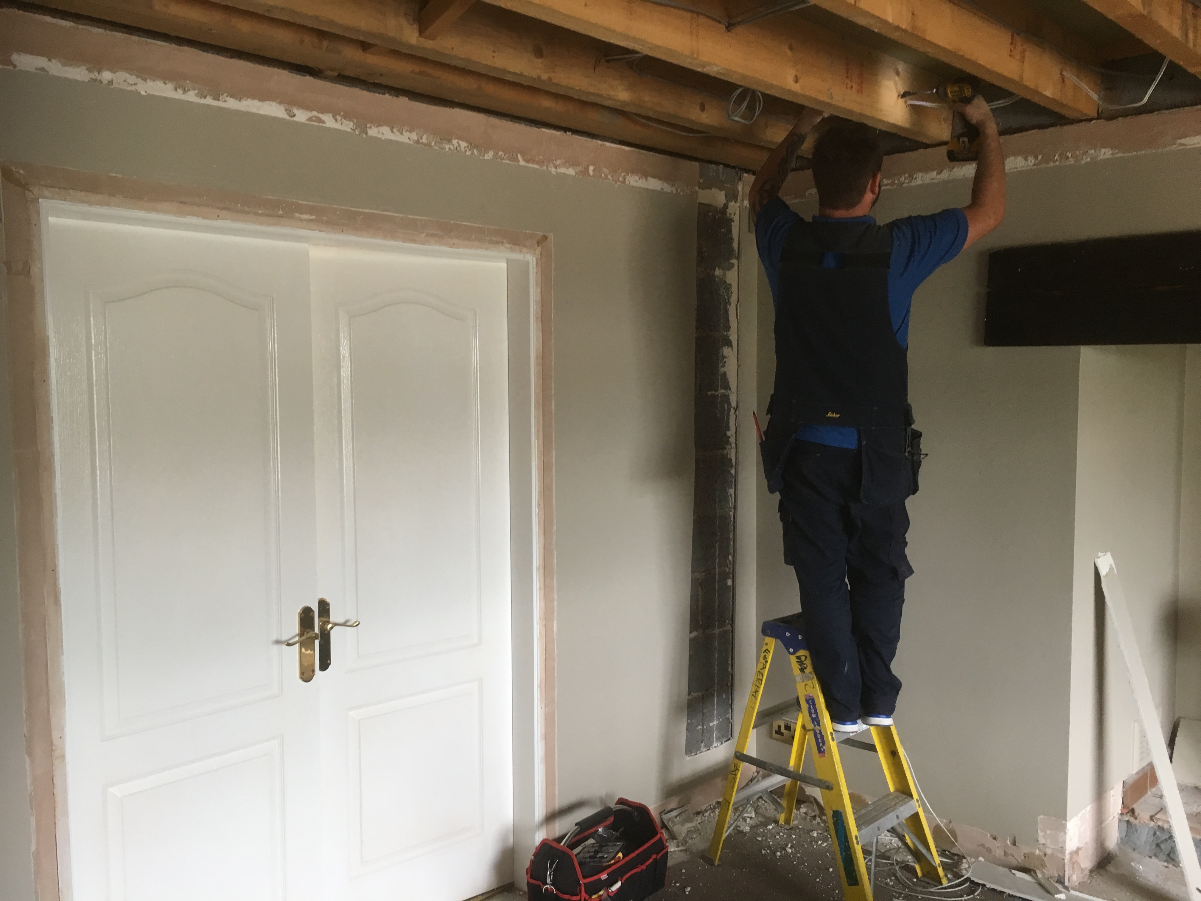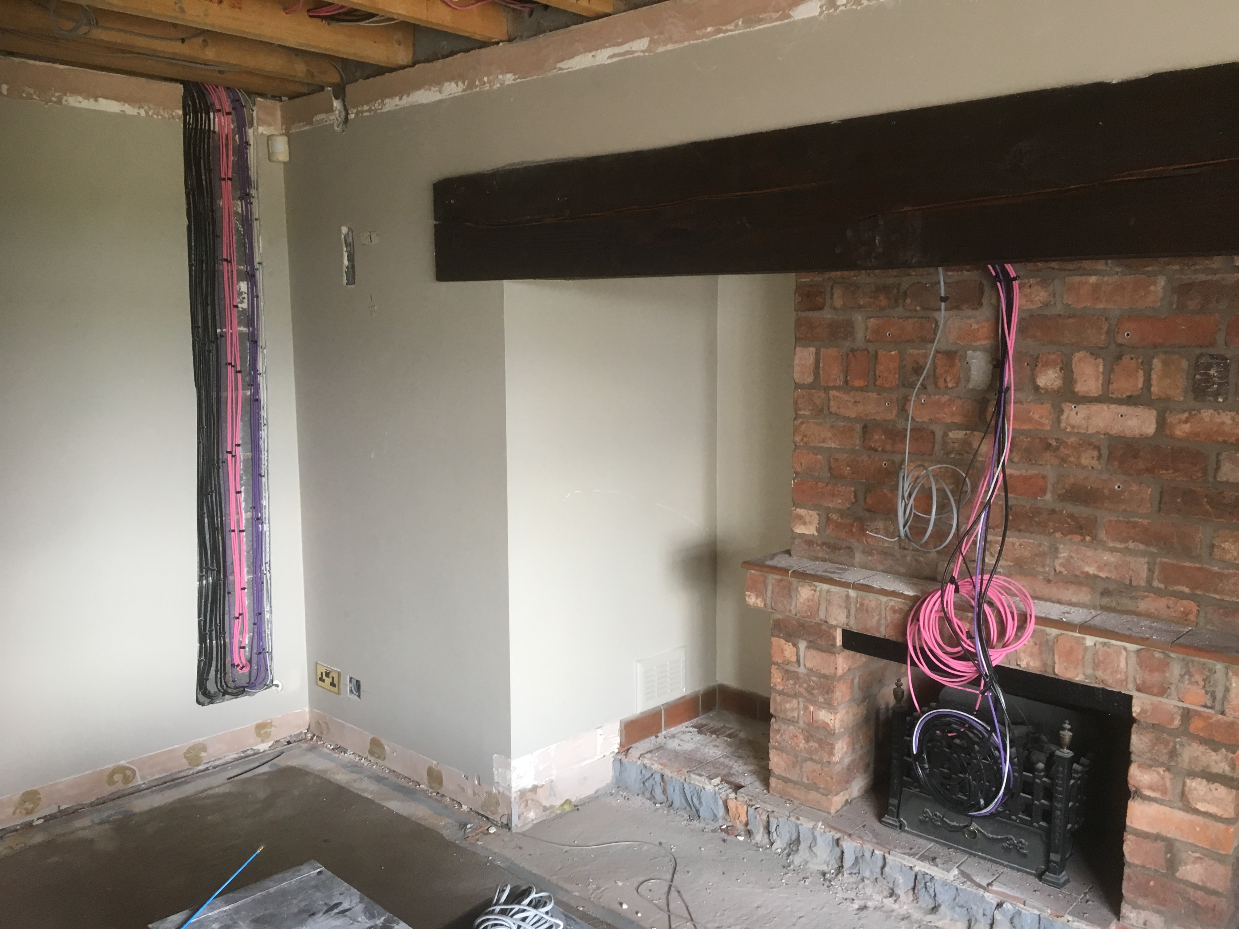 First fix: installtion of all cat, coax, speaker and electrical cables to positions. Ceiling taken down and walls choppped and chased. Clean and tidy house.