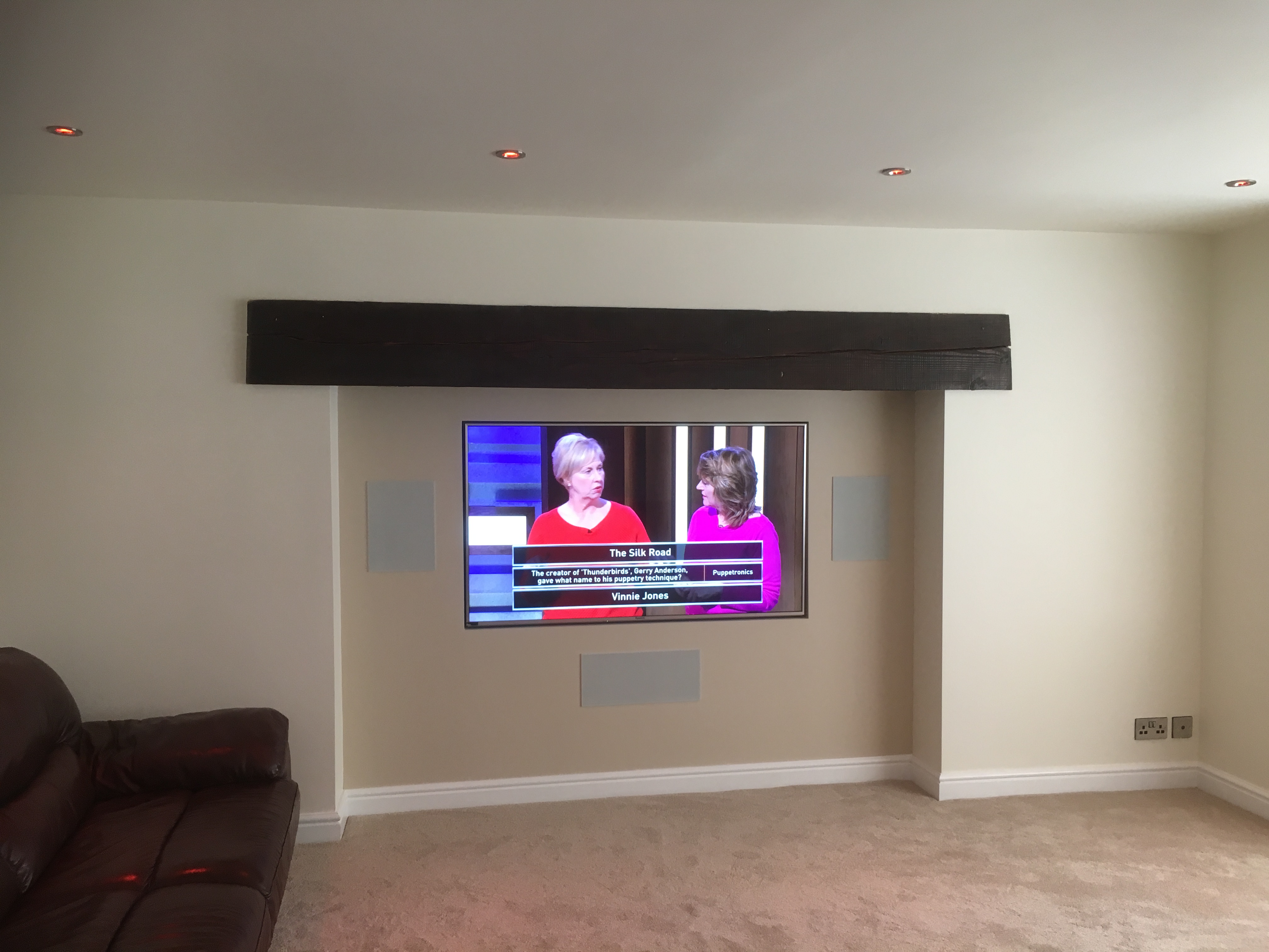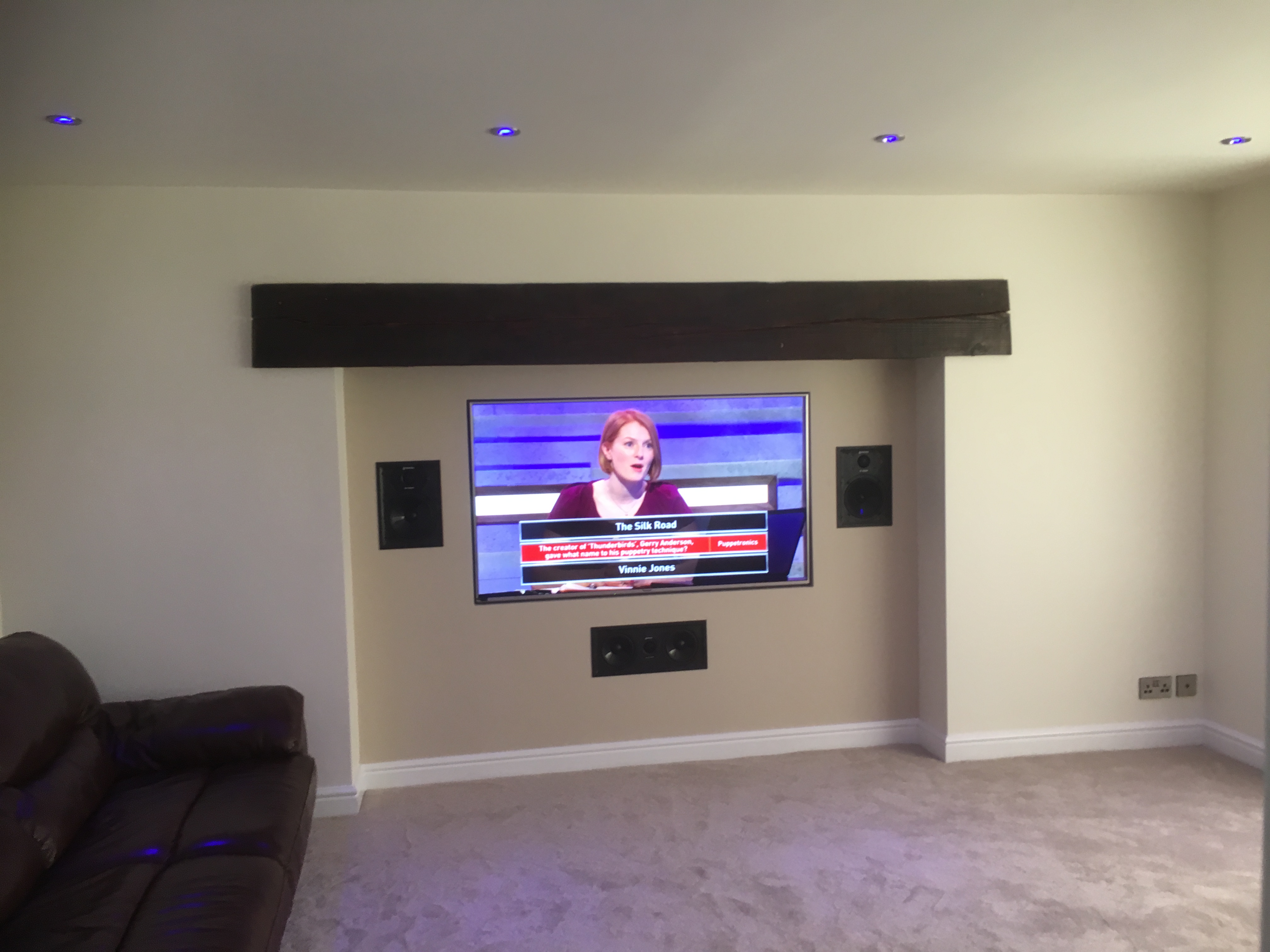 The customer wanted to update the living room and give it a modern feel to it. The living room had a inglenook fire place that made it look old fashioned and to put a tv above it wouldn't look right so we suggested to fill in the fre place with a stud wall keep the main beam support across and put the tv in there. They also wanted a cinema room feel to it so we decided to put a full Dolby 5.1 surround system in which rocked the place. Speakers to be discreet in wall and ceiling.